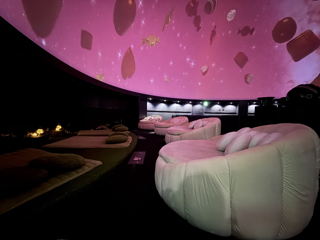 なかでも今回贅沢をしたのが、限定数しかないプレミアムな**「雲シート」**。 真っ白でふわふわなソファに体を預けると、まるで雲の上から星空の物語を覗き見ているような感覚。リラックスできるのはもちろん、ドーム前方の特等席から見上げる星空は圧巻の迫力でした。