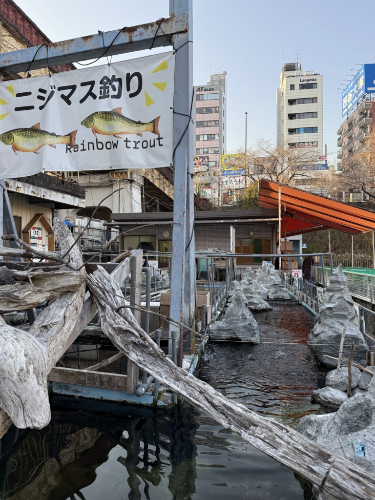 鯉釣りでボウズ(0匹)だった夫を励ますという名目のもと、ニジマスエリアへ移動。 鯉の池とは違い、水が透き通っていたり、逆に泡立っていてウキが見えなかったりと、魚の性格も池の様子も全く違います。 「あー、また餌だけ取られた!」と一喜一憂しながら、ようやく夫も1匹を釣り上げ、私も粘りに粘ってラスト1匹をゲット。