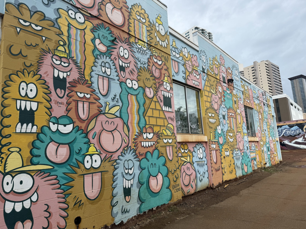 20分ほど歩き、カカアコ地区に足を踏み入れると、風景が一変しました。そこは、倉庫街のような建物に、色彩豊かな巨大な絵が描かれた「アートの街」。