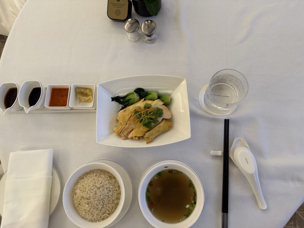 部屋にワゴンごと運ばれてきて、広々とした部屋で二人きりで食べるチキンライスは、格別な体験でした。タレも数種類ついており、とても美味しく、最高の夜ご飯となりました。