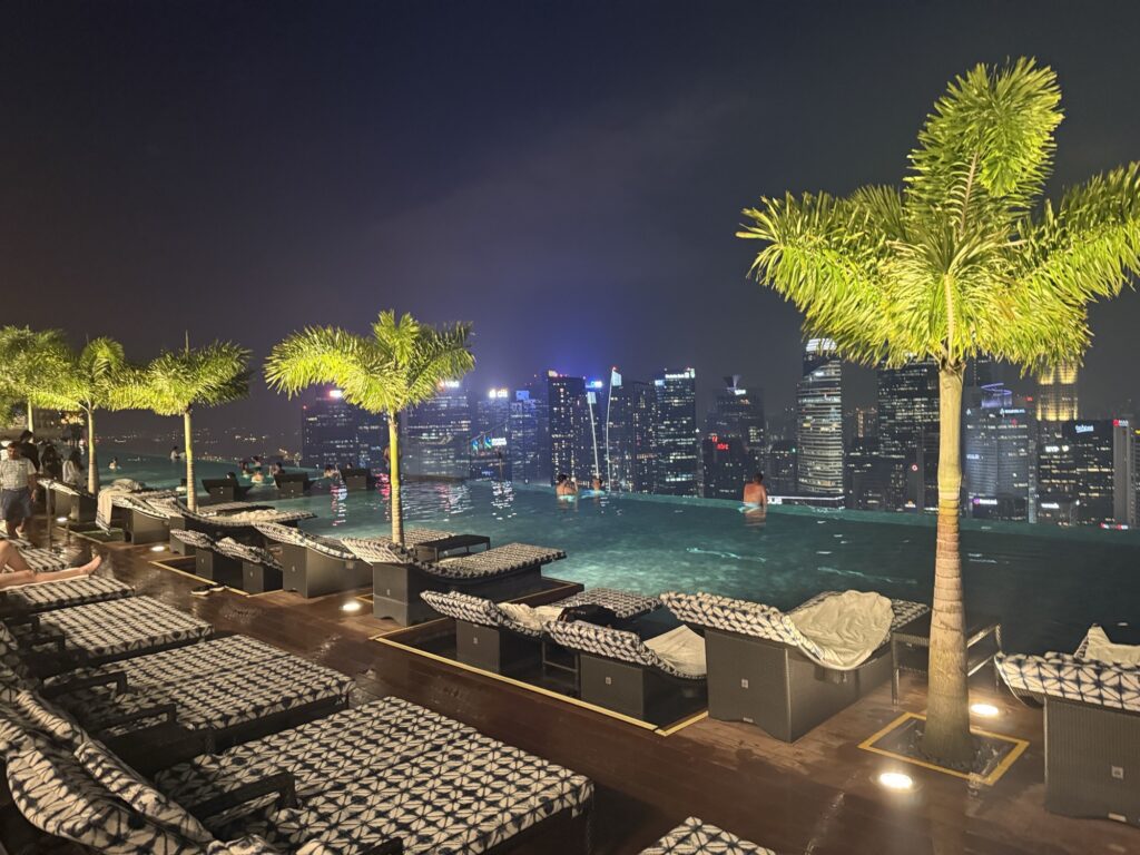 カジノを楽しんだ後、私たちはもう一度プールへ!夜景に囲まれながらのインフィニティプールは格別です。私も夜景の中を泳ぎましたが、シンガポールは夜でも暑いとはいえ、57階は風があり少し寒く感じました